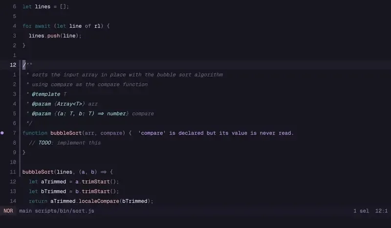 lines.sort((a, b) => { let aTrimmed = a.trimStart() let bTrimmed = b.trimStart() return aTrimmed.localeCompare(bTrimmed)})