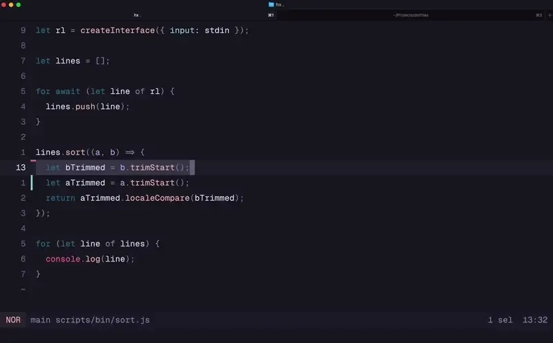 lines.sort((a, b) => { let aTrimmed = a.trimStart() let bTrimmed = b.trimStart() return aTrimmed.localeCompare(bTrimmed)})
